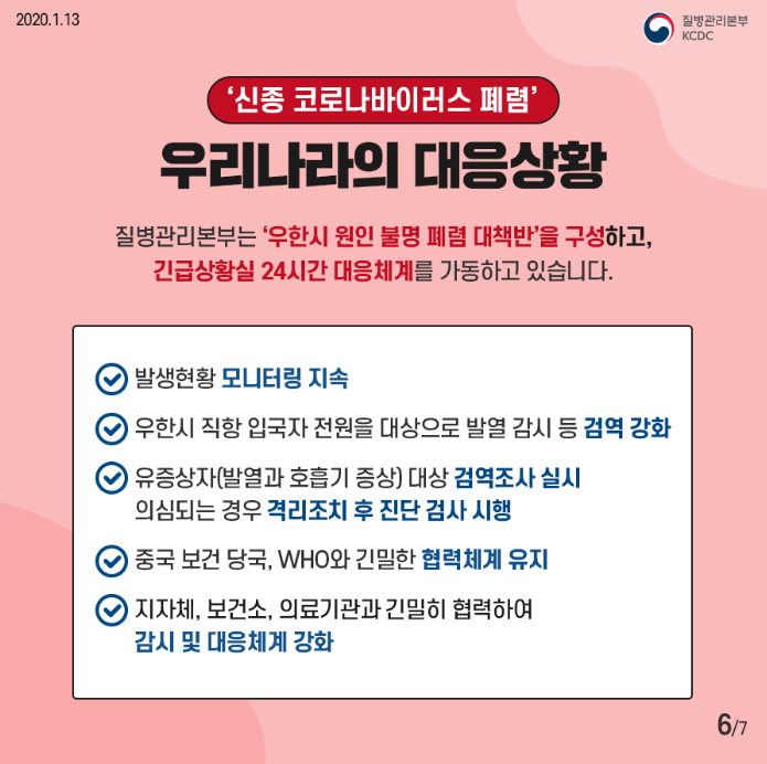 먼저 의심환자 사례정의를 강화해 중국 우한시 방문자 중 14일 이내에 발열, 호흡기증상을 보이는 환자에 대해서는 신속한 사례분류와 진단검사를 수행할 계획이라고 하며, 시·도별 지자체는 대책반 구성과 설 연휴 비상방역근무체계를 가동해서 질병관리본부는 판 코로나바이러스 검사법을 시도 보건환경연구원에 이관해 신속한 검사가 가능하도록 돕는다고 합니다.