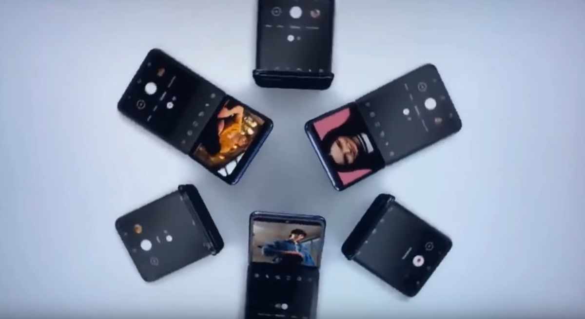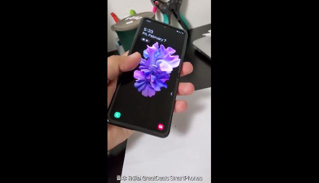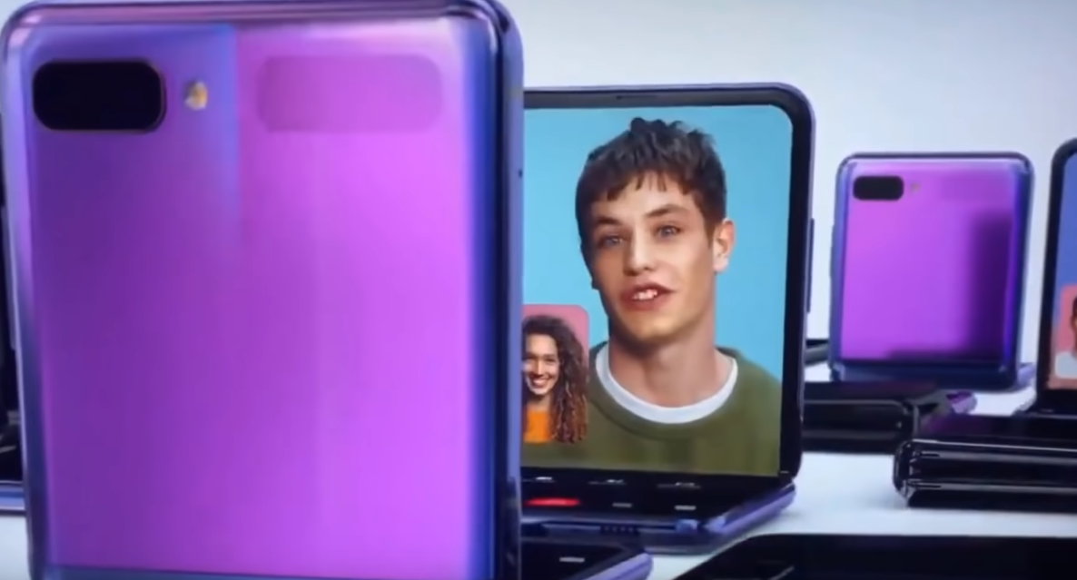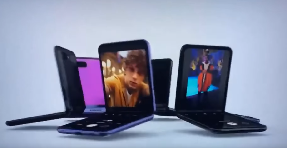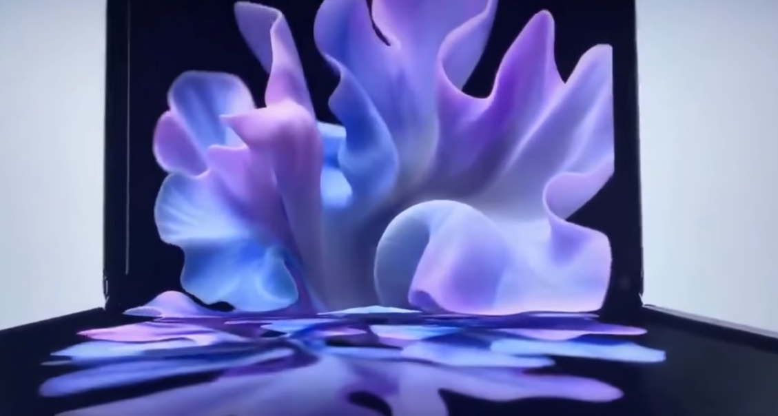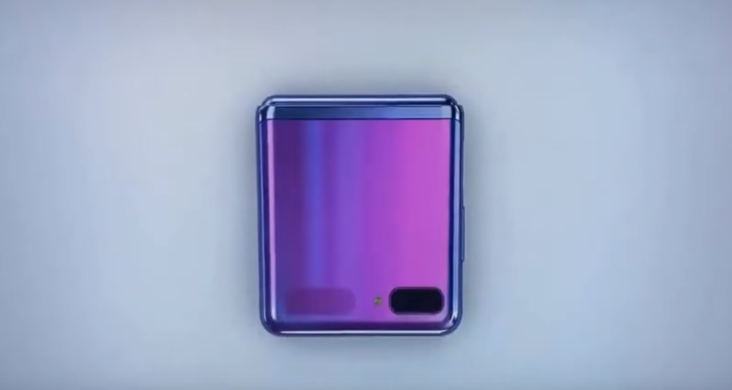 영상에는 갤럭시Z플립의 화면이 다양한 각도로 접혔다가 펼쳐지는 모습이 담겼으며, 색상은 퍼플과 블랙 두 가지가 소개되었고 화면을 펼치자 화면 전체에 디스플레이가 탑재된 모습이 나옵니다.
